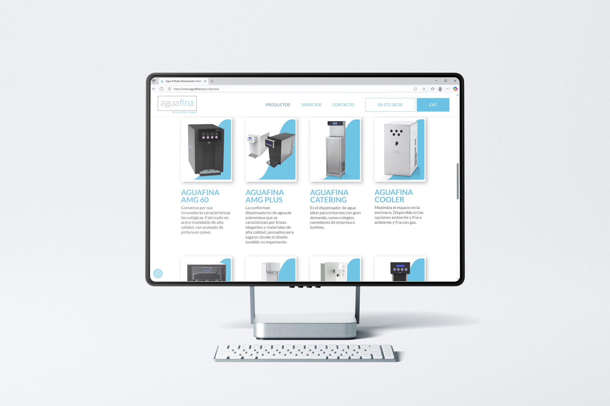 El sitio de AguaFina destaca por su presentación clara y fácil de navegar, ofreciendo un amplio catálogo de productos de fuentes de agua adaptadas a diferentes entornos, desde oficinas hasta grandes espacios como colegios o industrias.